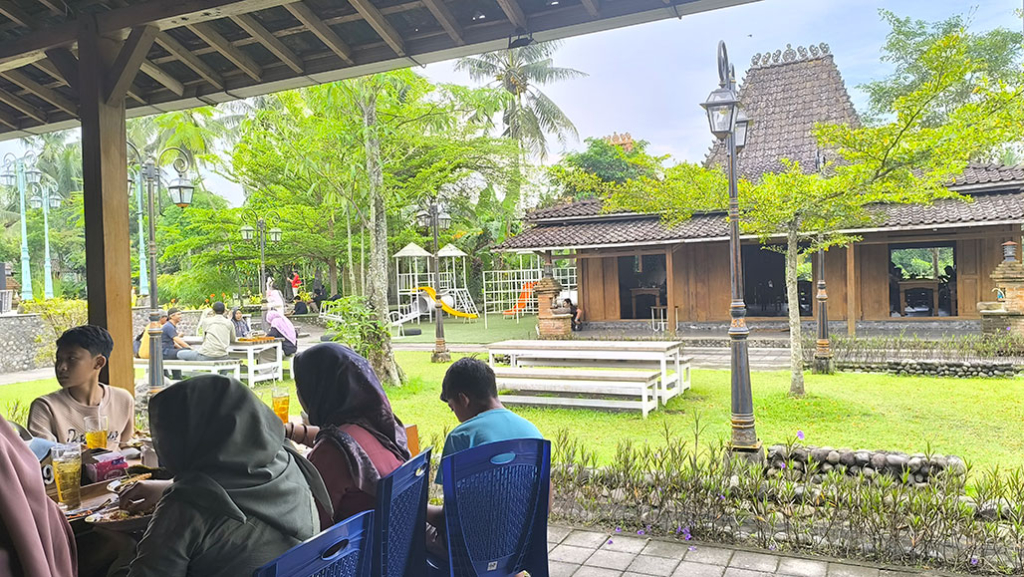 Kamu bisa memilih makan di area pendopo dengan nuansa tradisional Jawa yang kental, atau menikmati suasana taman yang lebih santai dan terbuka. Jika kamu datang pada sore hari, kesejukan khas Magelang akan terasa semakin nyaman, apalagi jika ditemani angin sepoi-sepoi.